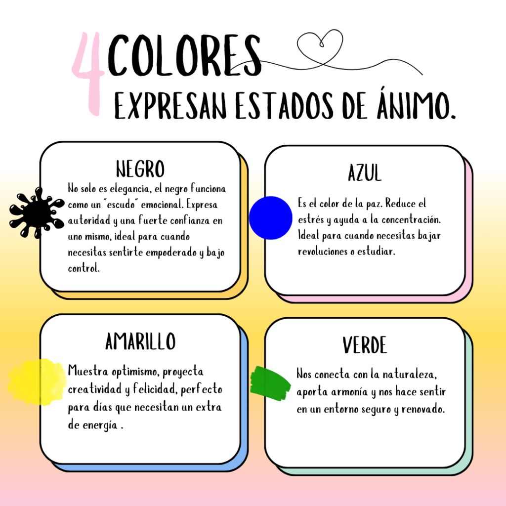 No es casualidad que hoy hayas elegido ese color. Los colores son el espejo de nuestras emociones y una herramienta poderosa para proyectar lo que sentimos. Desde la calma del azul hasta la fuerza del negro, cada tono tiene un vibe que influye en tu estado de ánimo y en cómo te mira el mundo.